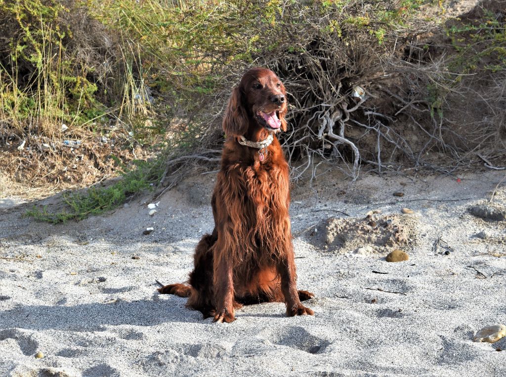 Flavy , fille de Décibel et Jonola Dr Doolittle . C'est une chienne vif, très joyeuse , heureuse , toujours contente, caractère formidable ,très câline , très sage bref tout va bien. Passionnée pour la chasse. toisée à 59cms lors de la confirmation. Flavy nous a donné une 1ère portée le 09/08/2012, 11 chiots . Elle a joué son rôle de maman avec admiration , très attentive , protectrice.... une 2èmé portéé de 10 chiots nés le 15.08.2014. sa 3éme portée de 11 chiots nés le 09.08.2016 Flavy est notre fierté !!! c'est une chienne exeptionnelle à la maison ou sur le ring ... que du bonheur !!! Elle n'a plus rien a prouvé , jugée en expo sous près de 50 juges différents les rapports sont toujours élogieux et les résultats excellents. En 2013, 2015 et 2016Flavy est classée 1er au TOP CHIEN de sa race. en 2017 Meilleur Setter Irlandais DOG REVELATION. 1er TOP CHIEN SETTER IRLANDAIS A SAN MARINO 2017 Elle est championne Internationale d'Exposition, Championne de Croatie, Championne d'Allemagne VDH, Championne de San Marino, Championne de Bosnie, Championne fédérale Bosnie Herzegovine, Championne de Montenegro, Championne de Serbie, Championne des Balkans, Championne Of The Adriatic, Championne of The Méditerranean. Championne Vétéran Gibraltar-championne vétéran d'Allemagne-championne vétéran Croatie- Championne vétéran San Marino-Championne vétéran Bosnie Herzegovine
